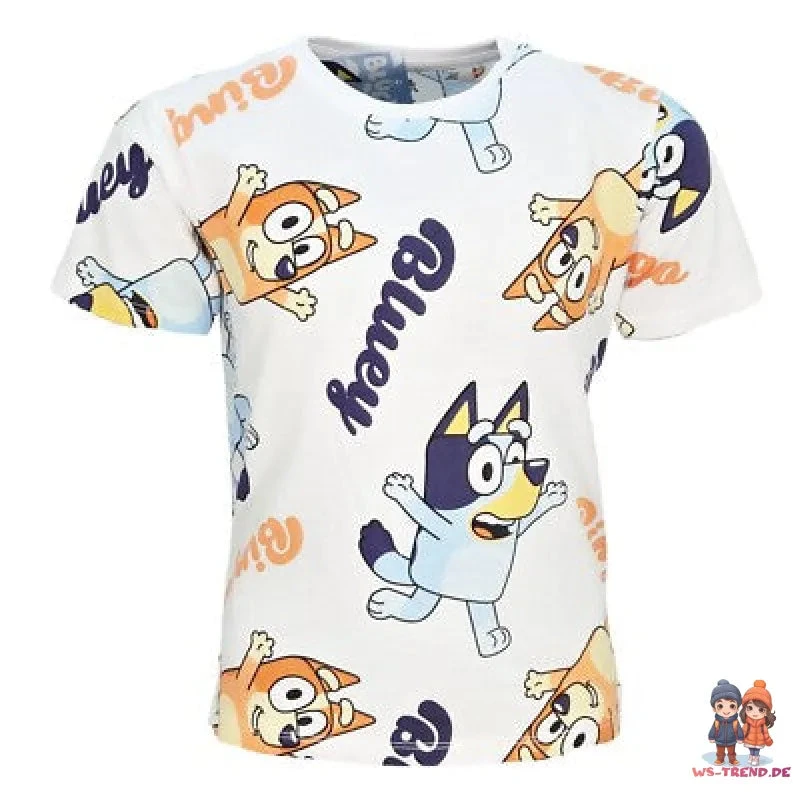 Technische Daten: Größen: 104, 110, 116, 122 Material: 100 % Baumwolle Design: Allover-Print mit Bluey und Bingo Ausschnitt: Rundhals Ärmellänge: Kurzarm