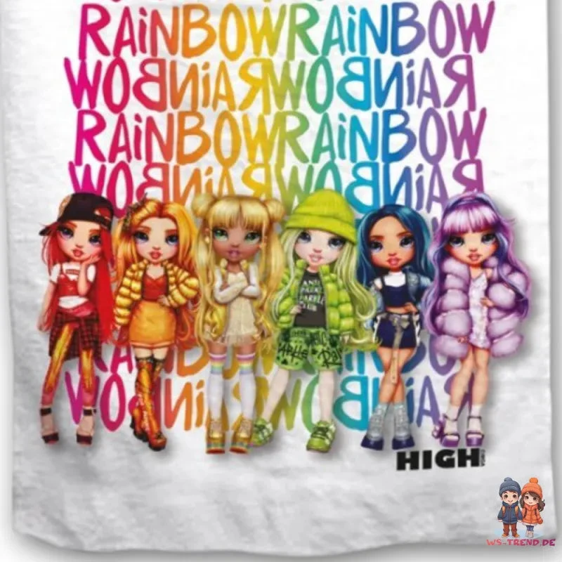 ✅ Buntes Rainbow High Design: Das Tuch zeigt die modischen Rainbow High Girls in lebendigen Farben und einem auffälligen Schriftzug „RAINBOW“, das garantiert alle Blicke auf sich zieht.